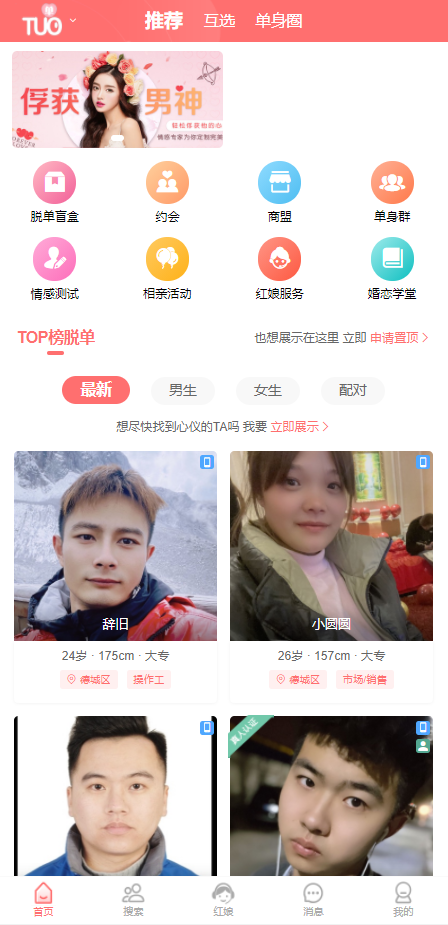 婚戀APP介紹婚戀交友APP主要功能:【異性推薦】精zhun條件搜索,智能雙向匹配,輕松約到稱(chēng)心如意的對(duì)象【精zhun匹配】--根據(jù)您的資料,推薦匹配異性【會(huì)員豐富】--上億單身男女,在線(xiàn)尋找有緣人【紅娘服務(wù)】--您身邊的貼身婚戀專(zhuān)家,相親就靠她【安全可靠】--嚴(yán)格身份核查,真人照片,真實(shí)資料【免費(fèi)通話(huà)】通過(guò)“密號(hào)”與心儀異性通話(huà),...